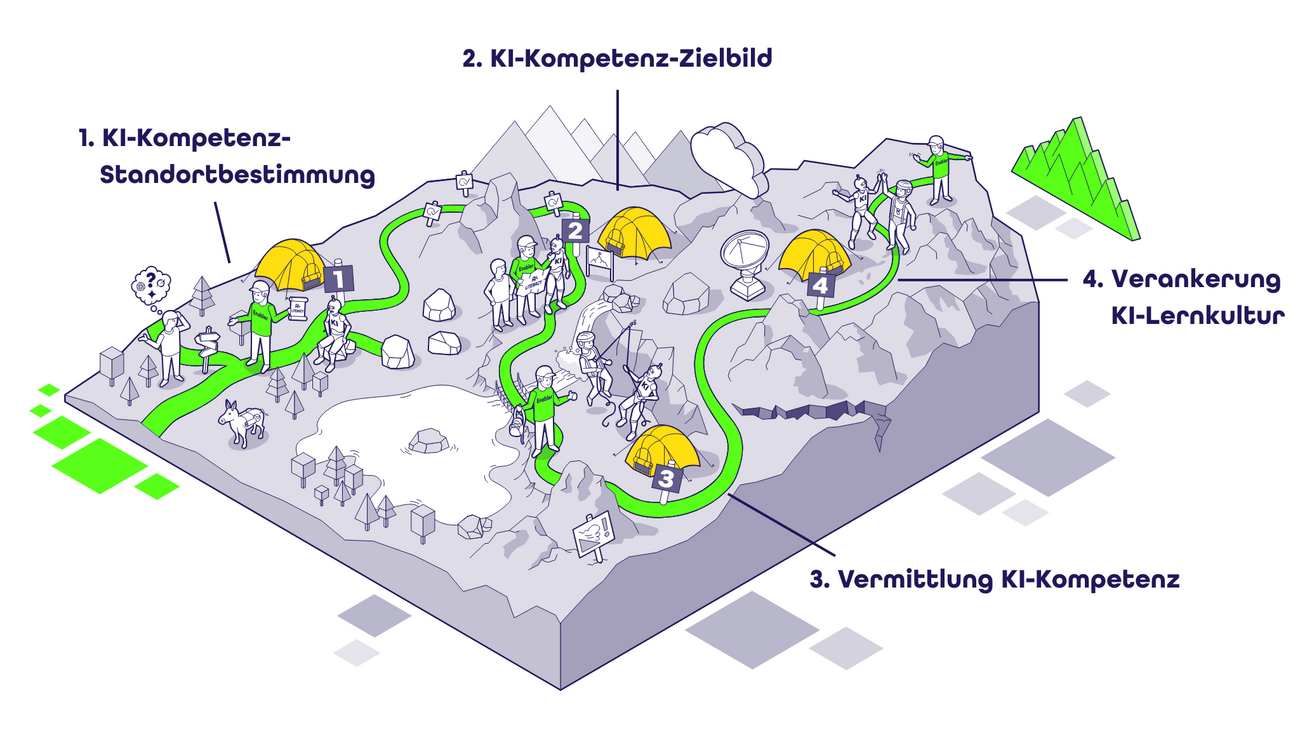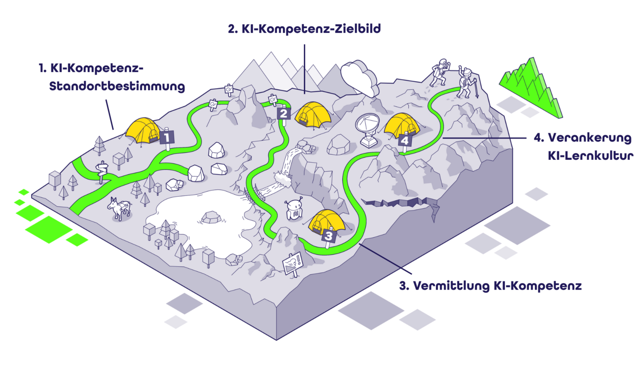 Wir begleiten euch auf eurer KI-Kompetenz-Journey mit unserem praxisnahen und erprobten Vorgehen für den Auf- und Ausbau von KI-Kompetenz: